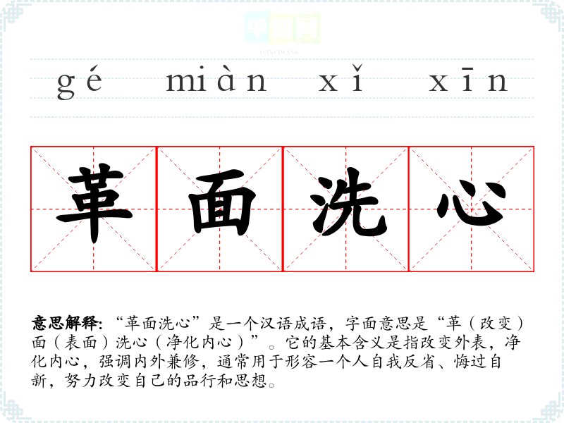 “革面洗心”是一个汉语成语,字面意思是“革(改变)面(表面)洗心(净化内心)”。它的基本含义是指改变外表,净化内心,强调内外兼修,通常用于形容一个人自我反省、悔过自新,努力改变自己的品行和思想。