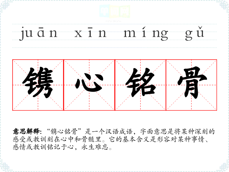 该成语的来源并不明确,但可以推测其构成的字词在古代文学、哲学中有类似的表达。镌和铭都与刻印有关,象征着对某种情感或经历的深刻记忆。类似的成语如“铭记于心”也表达了相似的含义。