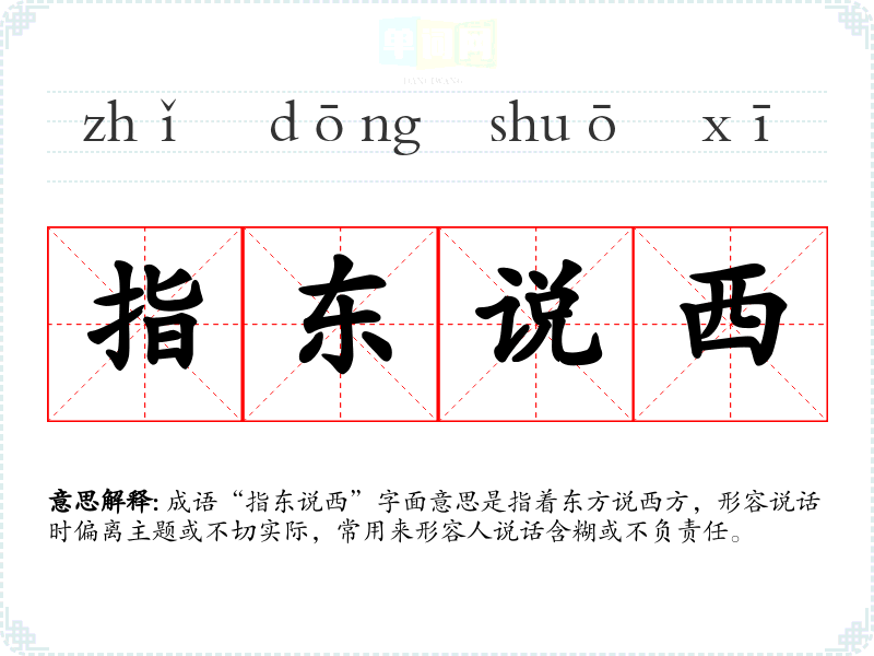 成语“指东说西”字面意思是指着东方说西方,形容说话时偏离主题或不切实际,常用来形容人说话含糊或不负责任。
