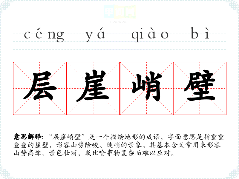 “层崖峭壁”是一个描绘地形的成语,字面意思是指重重叠叠的崖壁,形容山势险峻、陡峭的景象。其基本含义常用来形容山势高耸、景色壮丽,或比喻事物复杂而难以应对。