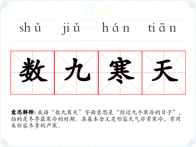 - 日常对话:在朋友间的闲聊中,可以用来形容天气的寒冷,例如“最近真是数九寒天,出门得多穿衣服。”
