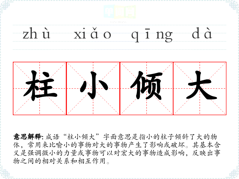 成语“柱小倾大”字面意思是指小的柱子倾斜了大的物体,常用来比喻小的事物对大的事物产生了影响或破坏。其基本含义是强调微小的力量或事物可以对宏大的事物造成影响,反映出事物之间的相对关系和相互作用。