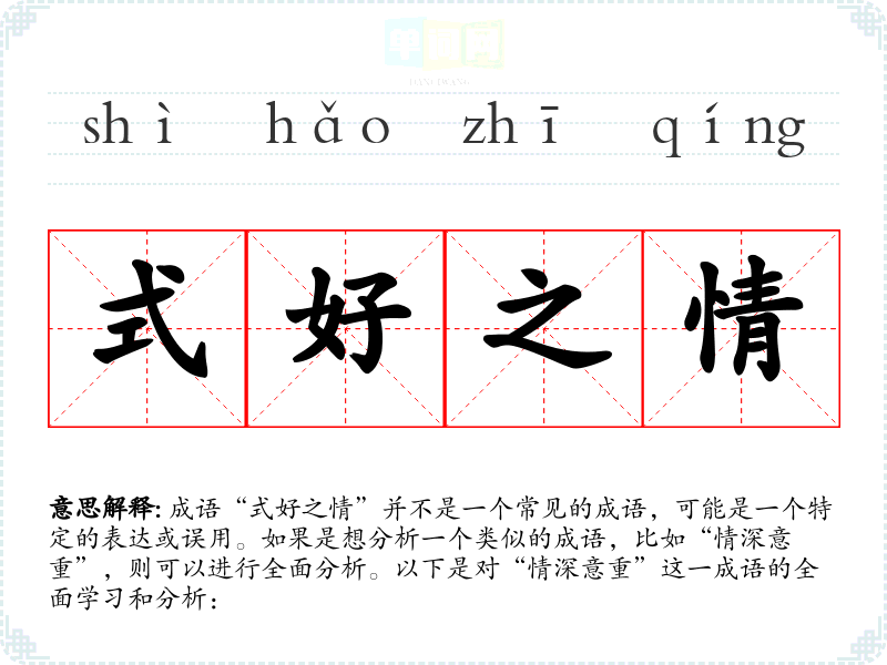 成语“式好之情”并不是一个常见的成语,可能是一个特定的表达或误用。如果是想分析一个类似的成语,比如“情深意重”,则可以进行全面分析。以下是对“情深意重”这一成语的全面学*和分析: