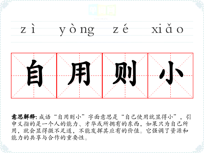 成语“自用则小”字面意思是“自己使用就显得小”,引申义指的是一个人的能力、才华或所拥有的东西,如果只为自己所用,就会显得微不足道,不能发挥其应有的价值。它强调了资源和能力的共享与合作的重要性。