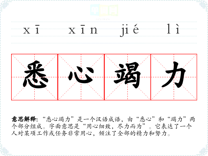 “悉心竭力”是一个汉语成语,由“悉心”和“竭力”两个部分组成。字面意思是“用心细致,尽力而为”。它表达了一个人对某项工作或任务非常用心,倾注了全部的精力和努力。