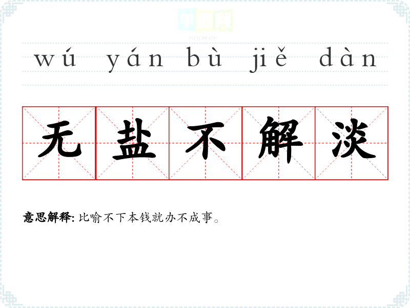 | 无盐不解淡 | 比喻不下本钱就办不成事。 |