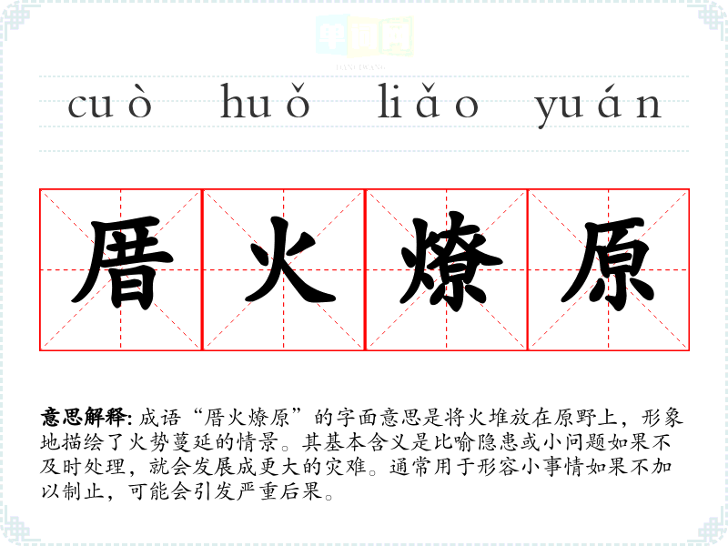 成语“厝火燎原”的字面意思是将火堆放在原野上,形象地描绘了火势蔓延的情景。其基本含义是比喻隐患或小问题如果不及时处理,就会发展成更大的灾难。通常用于形容小事情如果不加以制止,可能会引发严重后果。