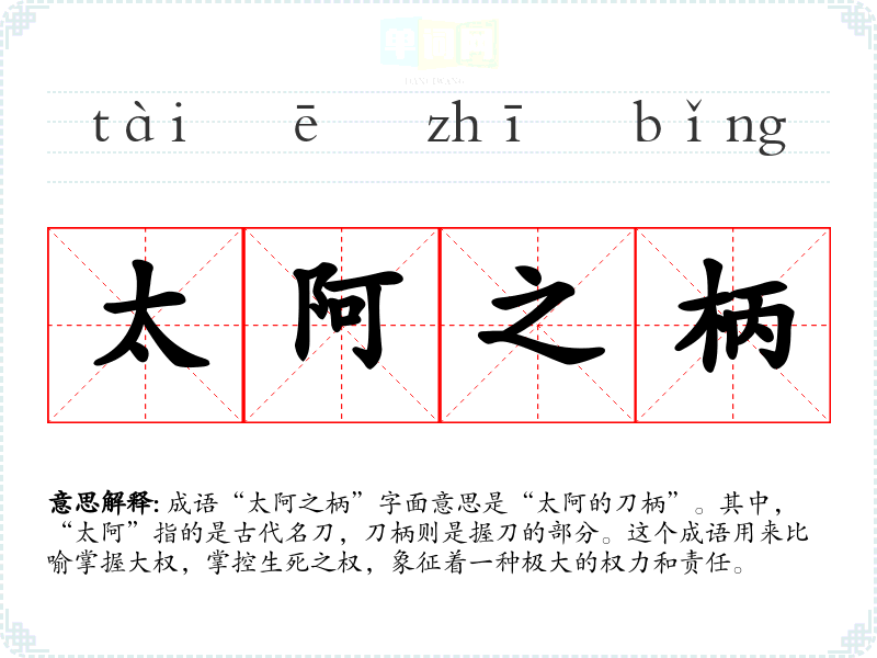“太阿之柄”源于《史记·平原君赵胜列传》。传说中,太阿是春秋时期的名剑,刀柄象征着权力。当时,掌握太阿之柄的人可以决定生死,权力之大不言而喻。因此,这个成语反映了古代对权力的看重和对责任的警惕。