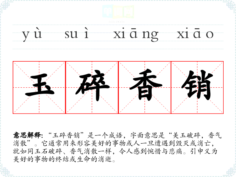 该成语的出处与古代文人对美的追求及其脆弱性有密切关系。其中,"玉"象征着美好与珍贵,而"香"则代表着美丽与芬芳。成语的历史背景可以追溯到古代诗词中对美的描绘与对生命无常的感慨,尤其是在古代文学中,常见用玉和香来比喻美好的人或事物。