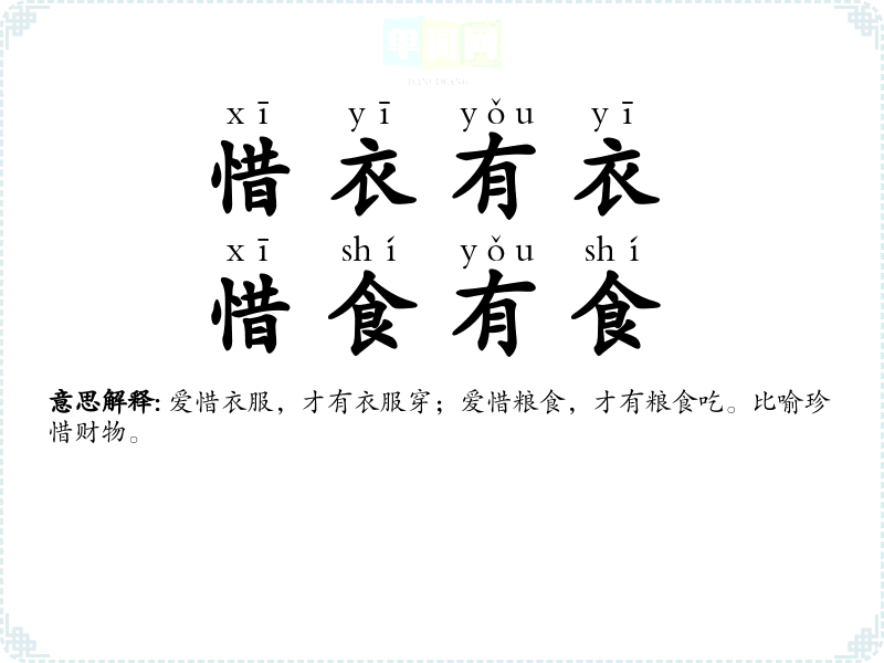 | 惜衣有衣,惜食有食 | 爱惜衣服,才有衣服穿;爱惜粮食,才有粮食吃。比喻珍惜财物。 |