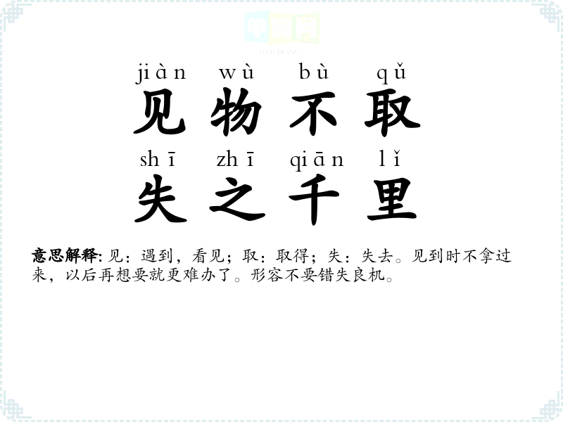 | 见之不取,思之千里 | 见到时不拿过来,以后再想要就更难办了。 |