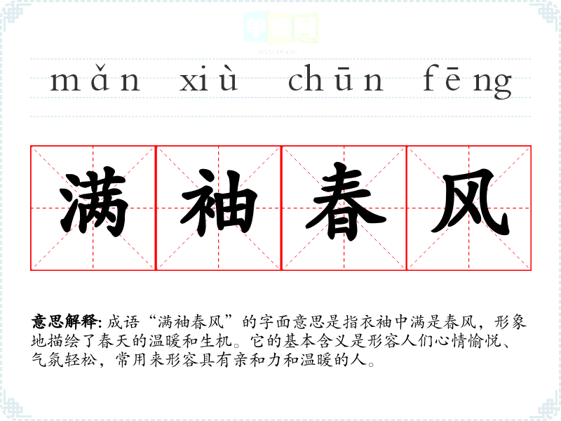 成语“满袖春风”的字面意思是指衣袖中满是春风,形象地描绘了春天的温暖和生机。它的基本含义是形容人们心情愉悦、气氛轻松,常用来形容具有亲和力和温暖的人。