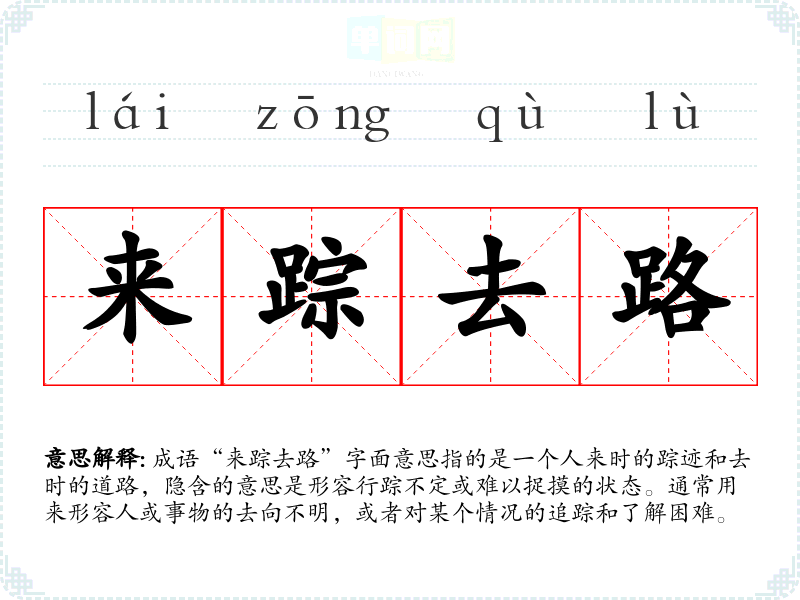 - 行踪不定:强调行踪不稳定,和“来踪去路”有相似的用法。