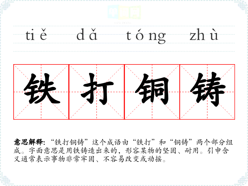 “铁打铜铸”这个成语由“铁打”和“铜铸”两个部分组成。字面意思是用铁铸造出来的,形容某物的坚固、耐用。引申含义通常表示事物非常牢固、不容易改变或动摇。