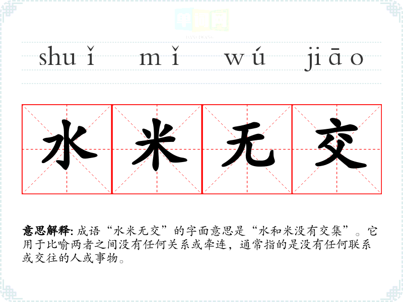 成语“水米无交”的字面意思是“水和米没有交集”。它用于比喻两者之间没有任何关系或牵连,通常指的是没有任何联系或交往的人或事物。