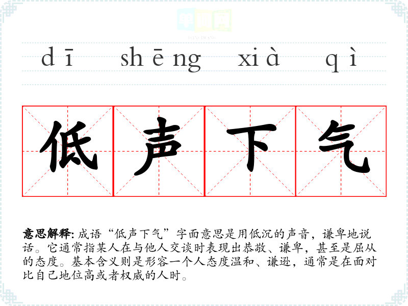 成语“低声下气”字面意思是用低沉的声音,谦卑地说话。它通常指某人在与他人交谈时表现出恭敬、谦卑,甚至是屈从的态度。基本含义则是形容一个人态度温和、谦逊,通常是在面对比自己地位高或者权威的人时。