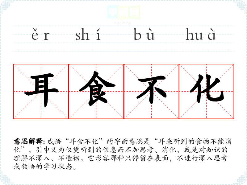 成语“耳食不化”的字面意思是“耳朵听到的食物不能消化”,引申义为仅凭听到的信息而不加思考、消化,或是对知识的理解不深入、不透彻。它形容那种只停留在表面,不进行深入思考或领悟的学*状态。