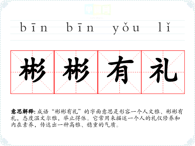 成语“彬彬有礼”的字面意思是形容一个人文雅、彬彬有礼,态度温文尔雅,举止得体。它常用来描述一个人的礼仪修养和内在素养,传达出一种高雅、稳重的气质。