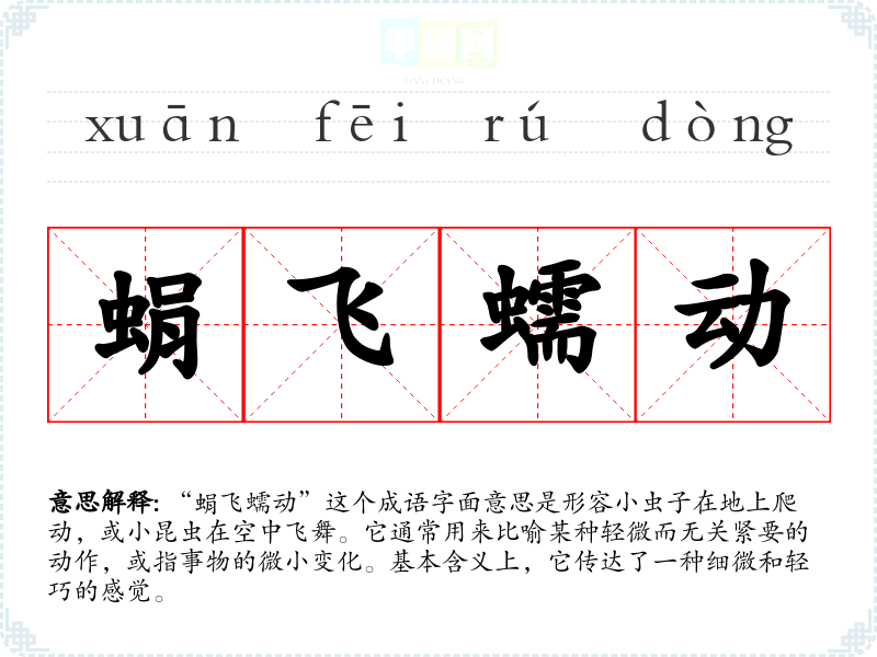 “蜎飞蠕动”这个成语字面意思是形容小虫子在地上爬动,或小昆虫在空中飞舞。它通常用来比喻某种轻微而无关紧要的动作,或指事物的微小变化。基本含义上,它传达了一种细微和轻巧的感觉。