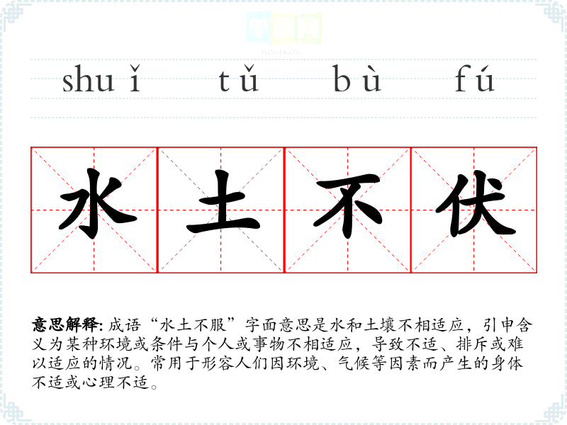 | 不伏水土 | 不能适应移居地方的气候和饮食习惯。同“不服水土”。 |