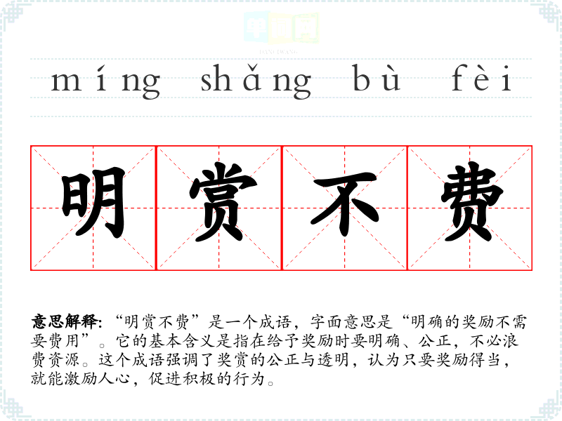 “明赏不费”是一个成语,字面意思是“明确的奖励不需要费用”。它的基本含义是指在给予奖励时要明确、公正,不必浪费资源。这个成语强调了奖赏的公正与透明,认为只要奖励得当,就能激励人心,促进积极的行为。
