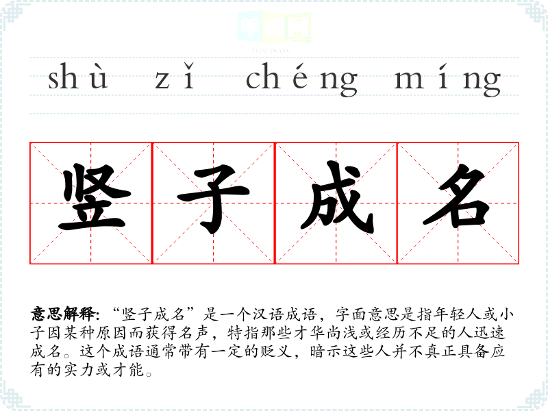 “竖子成名”是一个汉语成语,字面意思是指年轻人或小子因某种原因而获得名声,特指那些才华尚浅或经历不足的人迅速成名。这个成语通常带有一定的贬义,暗示这些人并不真正具备应有的实力或才能。