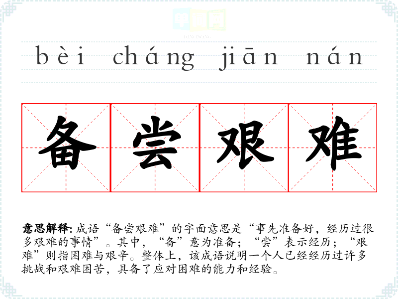 成语“备尝艰难”的字面意思是“事先准备好,经历过很多艰难的事情”。其中,“备”意为准备;“尝”表示经历;“艰难”则指困难与艰辛。整体上,该成语说明一个人已经经历过许多挑战和艰难困苦,具备了应对困难的能力和经验。