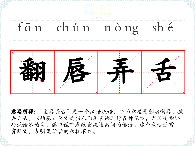 “翻唇弄舌”是一个汉语成语,字面意思是翻动嘴唇,操弄舌头。它的基本含义是指人们用言语进行各种花招,尤其是指那些说话不诚实、满口谎言或故意挑拨离间的话语。这个成语通常带有贬义,表明说话者的动机不纯。