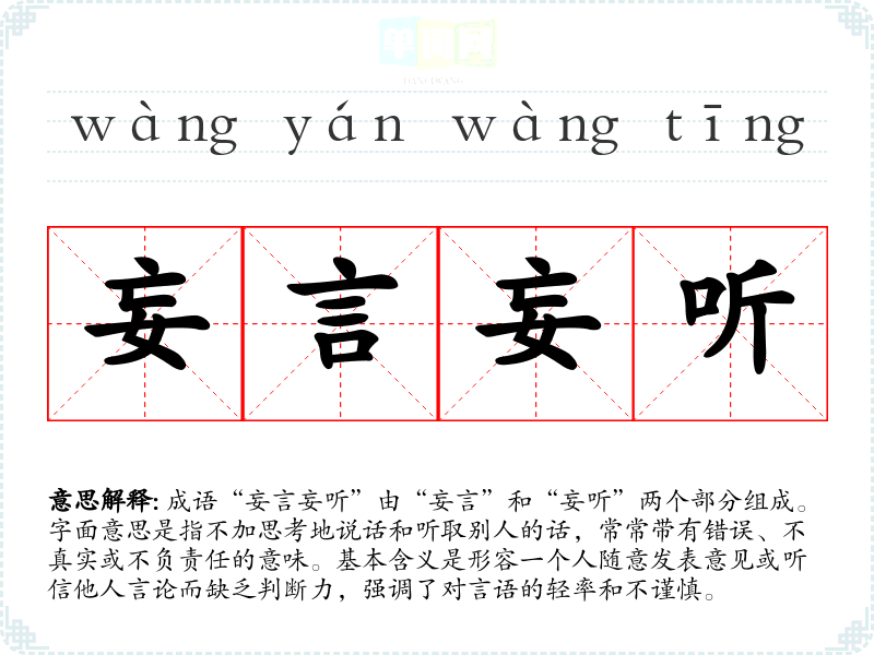 成语“妄言妄听”由“妄言”和“妄听”两个部分组成。字面意思是指不加思考地说话和听取别人的话,常常带有错误、不真实或不负责任的意味。基本含义是形容一个人随意发表意见或听信他人言论而缺乏判断力,强调了对言语的轻率和不谨慎。