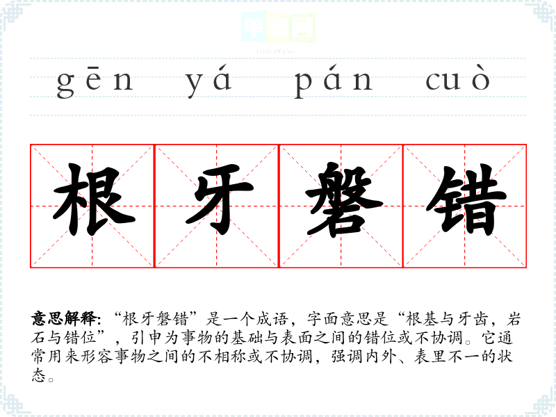“根牙磐错”是一个成语,字面意思是“根基与牙齿,岩石与错位”,引申为事物的基础与表面之间的错位或不协调。它通常用来形容事物之间的不相称或不协调,强调内外、表里不一的状态。