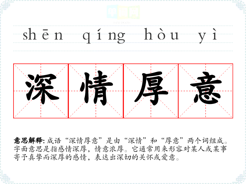 成语“深情厚意”是由“深情”和“厚意”两个词组成。字面意思是指感情深厚,情意浓厚。它通常用来形容对某人或某事寄予真挚而深厚的感情,表达出深切的关怀或爱意。