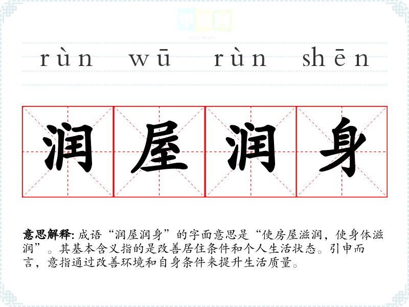 成语“润屋润身”的字面意思是“使房屋滋润,使身体滋润”。其基本含义指的是改善居住条件和个人生活状态。引申而言,意指通过改善环境和自身条件来提升生活质量。