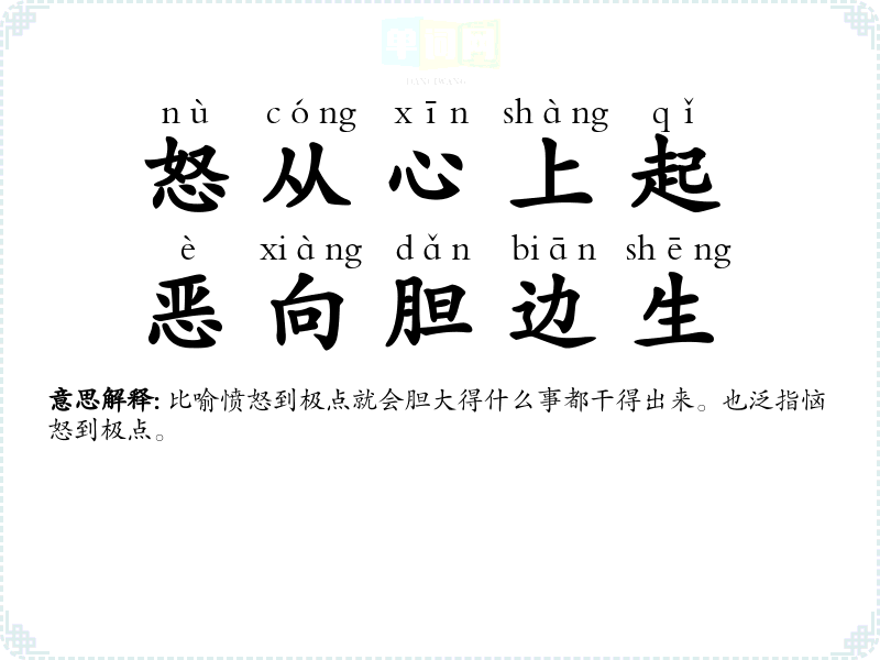 | 怒从心上起,恶向胆边生 | 比喻愤怒到极点就会胆大得什么事都干得出来。也泛指恼怒到极点。 |