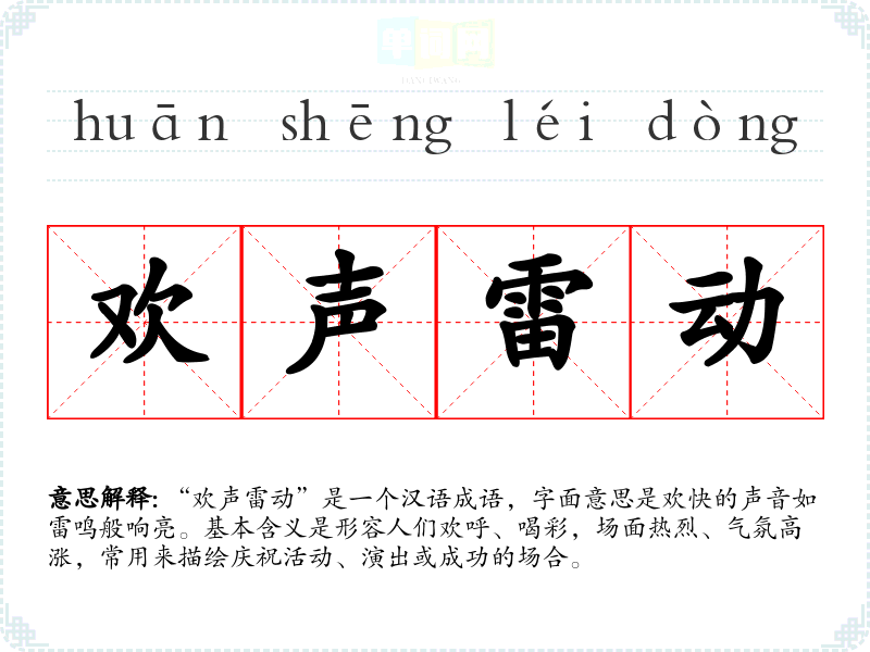 “欢声雷动”出自古代文人对热烈场面的描绘。虽然具体的历史典故不详,但在古代文学中,常常可以见到对欢声笑语、热烈祝贺的描写。这个成语反映了人们对欢乐场面的高度赞美,并且常用于形容盛大的庆典或活动。