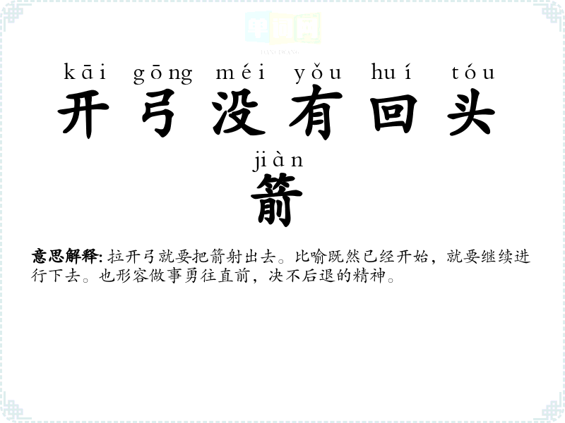 | 开弓没有回头箭 | 拉开弓就要把箭射出去。比喻既然已经开始,就要继续进行下去。也形容做事勇往直前,决不后退的精神。 |