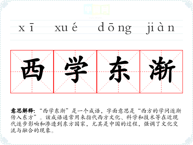 | 西学东渐 | 渐:流入;东渐:原指河水东流入海,引申为向东方流传。西方的自然科学和社会科学向东方流传。 |