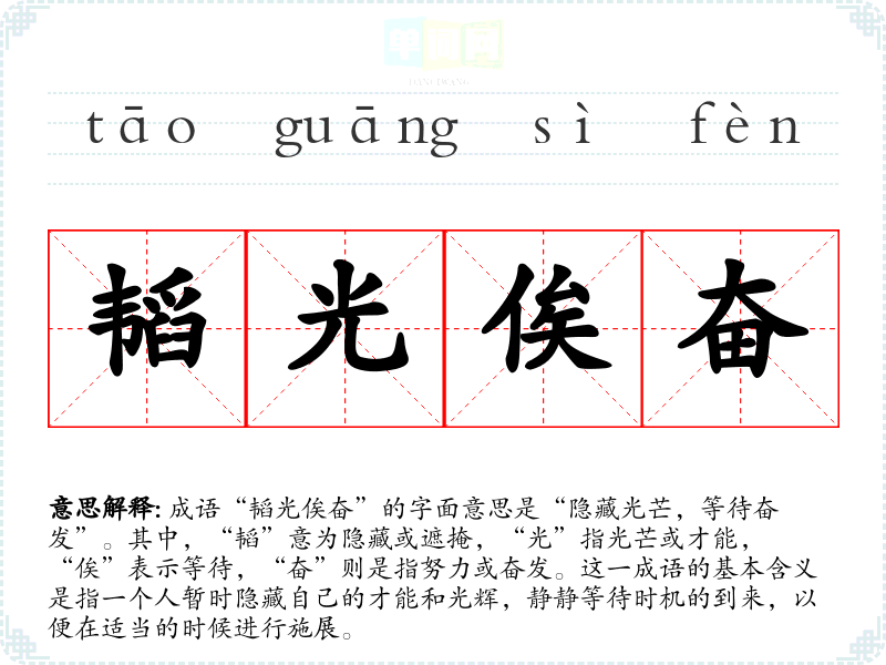 成语“韬光俟奋”的字面意思是“隐藏光芒,等待奋发”。其中,“韬”意为隐藏或遮掩,“光”指光芒或才能,“俟”表示等待,“奋”则是指努力或奋发。这一成语的基本含义是指一个人暂时隐藏自己的才能和光辉,静静等待时机的到来,以便在适当的时候进行施展。