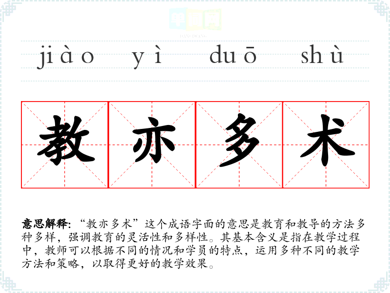 “教亦多术”这个成语字面的意思是教育和教导的方法多种多样,强调教育的灵活性和多样性。其基本含义是指在教学过程中,教师可以根据不同的情况和学员的特点,运用多种不同的教学方法和策略,以取得更好的教学效果。