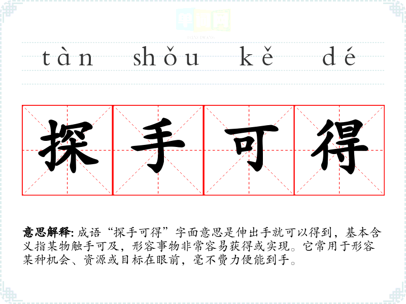 成语“探手可得”字面意思是伸出手就可以得到,基本含义指某物触手可及,形容事物非常容易获得或实现。它常用于形容某种机会、资源或目标在眼前,毫不费力便能到手。