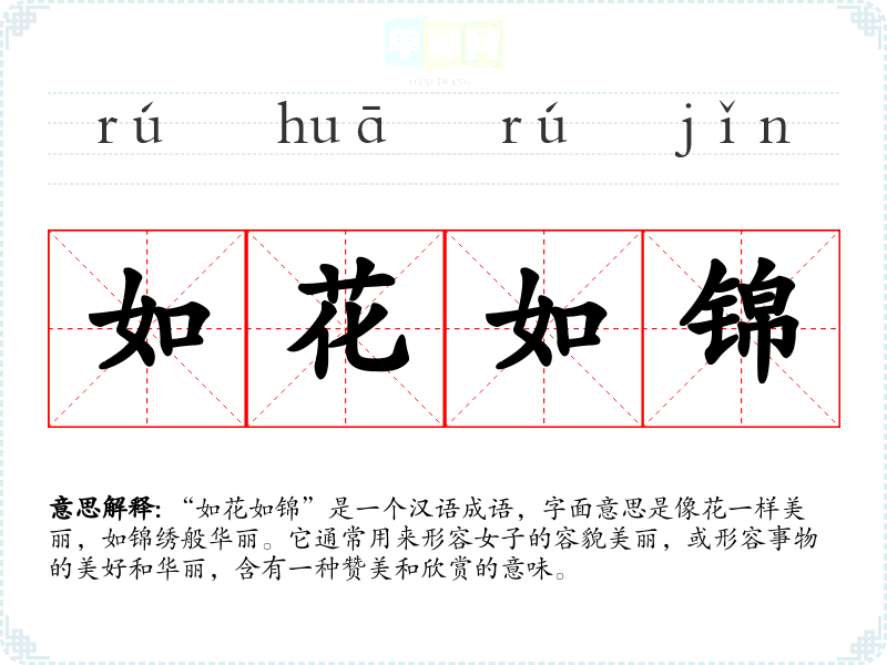 “如花如锦”是一个汉语成语,字面意思是像花一样美丽,如锦绣般华丽。它通常用来形容女子的容貌美丽,或形容事物的美好和华丽,含有一种赞美和欣赏的意味。