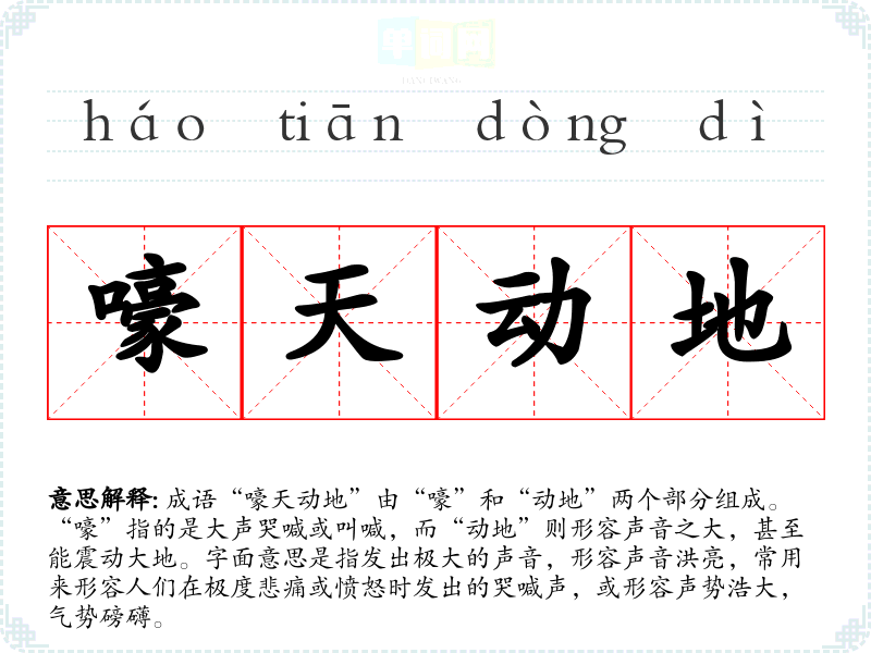 成语“嚎天动地”由“嚎”和“动地”两个部分组成。“嚎”指的是大声哭喊或叫喊,而“动地”则形容声音之大,甚至能震动大地。字面意思是指发出极大的声音,形容声音洪亮,常用来形容人们在极度悲痛或愤怒时发出的哭喊声,或形容声势浩大,气势磅礴。