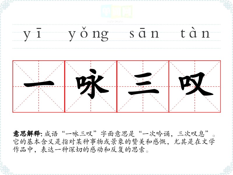 成语“一咏三叹”字面意思是“一次吟诵,三次叹息”。它的基本含义是指对某种事物或景象的赞美和感慨,尤其是在文学作品中,表达一种深切的感动和反复的思索。