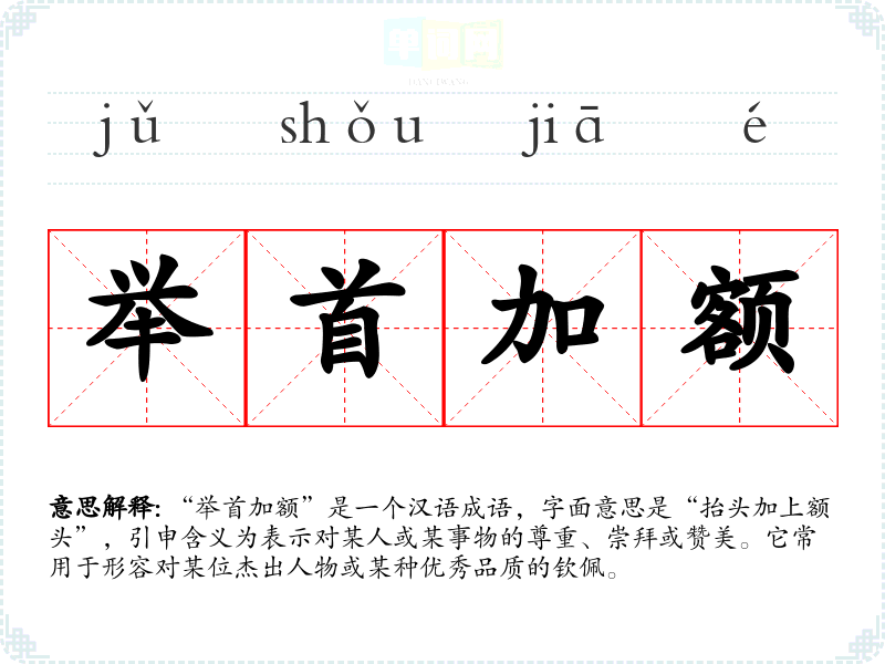 “举首加额”是一个汉语成语,字面意思是“抬头加上额头”,引申含义为表示对某人或某事物的尊重、崇拜或赞美。它常用于形容对某位杰出人物或某种优秀品质的钦佩。