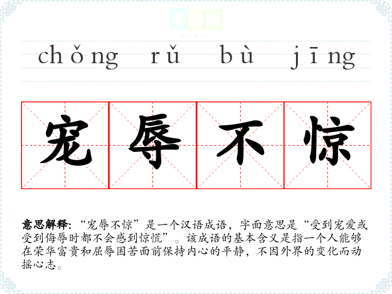 “宠辱不惊”是一个汉语成语,字面意思是“受到宠爱或受到侮辱时都不会感到惊慌”。该成语的基本含义是指一个人能够在荣华富贵和屈辱困苦面前保持内心的平静,不因外界的变化而动摇心志。