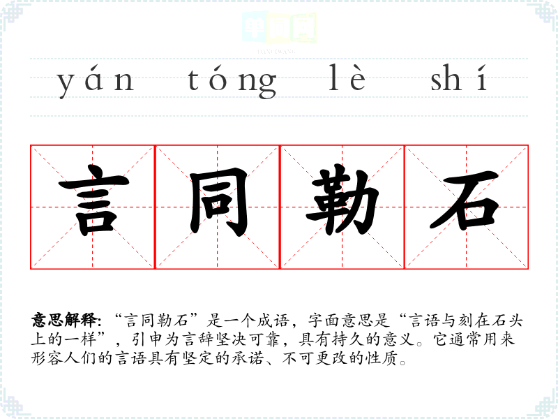 “言同勒石”是一个成语,字面意思是“言语与刻在石头上的一样”,引申为言辞坚决可靠,具有持久的意义。它通常用来形容人们的言语具有坚定的承诺、不可更改的性质。