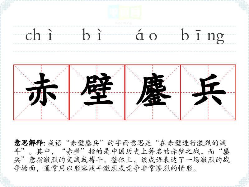 成语“赤壁鏖兵”的字面意思是“在赤壁进行激烈的战斗”。其中,“赤壁”指的是**历史上著名的赤壁之战,而“鏖兵”意指激烈的交战或搏斗。整体上,该成语表达了一场激烈的战争场面,通常用以形容战斗激烈或竞争非常惨烈的情形。