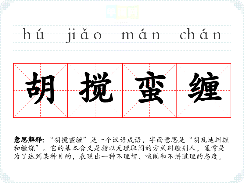 “胡搅蛮缠”是一个汉语成语,字面意思是“胡乱地纠缠和缠绕”。它的基本含义是指以无理取闹的方式纠缠别人,通常是为了达到某种目的,表现出一种不理智、喧闹和不讲道理的态度。