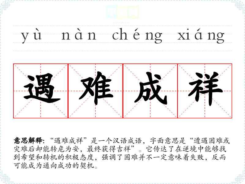 “遇难成祥”是一个汉语成语,字面意思是“遭遇困难或灾难后却能转危为安,最终获得吉祥”。它传达了在逆境中能够找到希望和转机的积极态度,强调了困难并不一定意味着失败,反而可能成为通向成功的契机。
