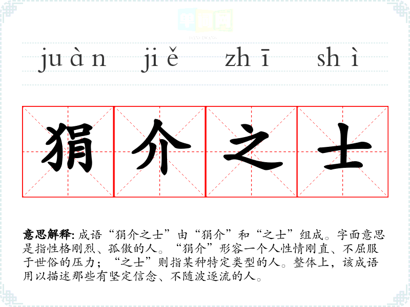 成语“狷介之士”由“狷介”和“之士”组成。字面意思是指性格刚烈、孤傲的人。“狷介”形容一个人性情刚直、不屈服于世俗的压力;“之士”则指某种特定类型的人。整体上,该成语用以描述那些有坚定信念、不随波逐流的人。