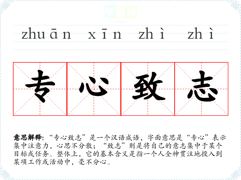 “专心致志”是一个汉语成语,字面意思是“专心”表示集中注意力,心思不分散;“致志”则是将自己的意志集中于某个目标或任务。整体上,它的基本含义是指一个人全神贯注地投入到某项工作或活动中,毫不分心。